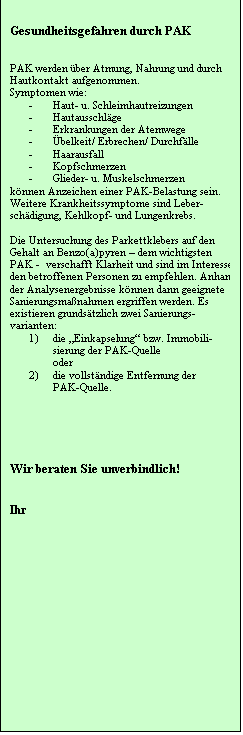 Eine Untersuchung des betroffenen (dunklen) Klebematerials durch Fachkräfte und die Sanierung zur Minimierung einer evtl. PAK-Belastung ist zu empfehlen.